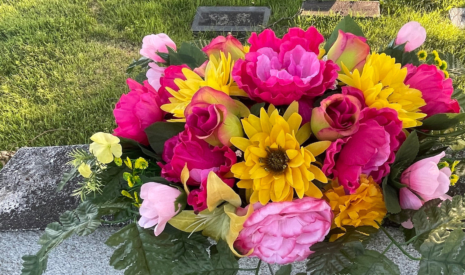 Honor your loved ones year-round with Graveside Flowers. We provide silk floral headstone sprays, vases, bushes, crosses and wreaths for any occasion.